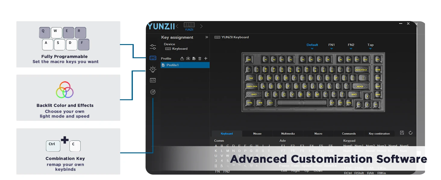 Up to 15 factory-set lights and music rhythm modes are free to choose from the keyboard. Custom software is also available for designing your new effects. Build macros, and set up per-key lighting and effects.