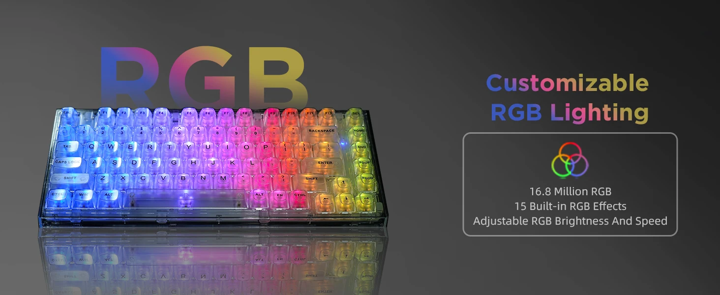 Pursuing ultimate transparency, the X75 takes a high-quality transparent polycarbonate keyboard top and buttom case, clear keycaps, and transparent crystal switches. The whole body is transparent, making the RGB lighting more gorgeous, creating a visible environment even under dark conditions.