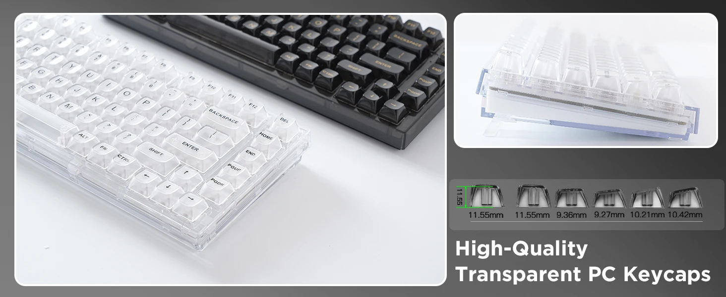 Pursuing ultimate transparency, the X75 takes prime PC material to mold the keycaps and print the characters through a digital printing process. The rigorous production ensures the keycaps survive wear-resistant and scratch-resistant tests. The keycap set is designed with an ASA profile for those who feel like sculpt-shaped keys and an ergonomic typing experience, with different heights in different rows.
